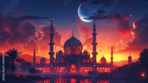 Eid Mubarak mosque with moon, Islamic mosque, Eid-al-Adha, the feast of sacrifice