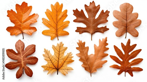 Eight Dried Autumn Leaves Arranged on White Background