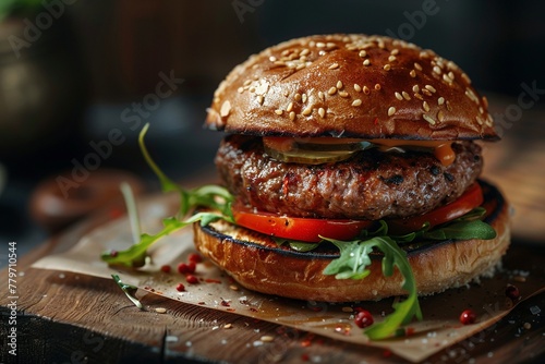 Ein saftiger Burger mit Knusprigem Brötchen auf einem Holzbrett