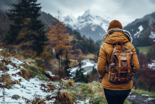 Eine Frau wandert auf einem Feldweg durch eine herbstliche Landschaft. Im Huntergrund verschneite Berge. KI generiert