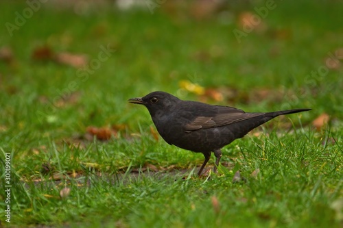 Eine weibliche Amsel stizt am Abend in einer grünen Wiese Turdus Merula
