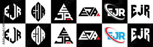 EJR letter logo design in six style. EJR polygon, circle, triangle, hexagon, flat and simple style with black and white color variation letter logo set in one artboard. EJR minimalist and classic logo