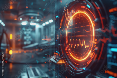 EKG readout of a steady heartbeat full screen on a futuristic round monitor, Abstract background
