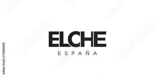 Elche in the Spain emblem. The design features a geometric style, vector illustration with bold typography in a modern font. The graphic slogan lettering.