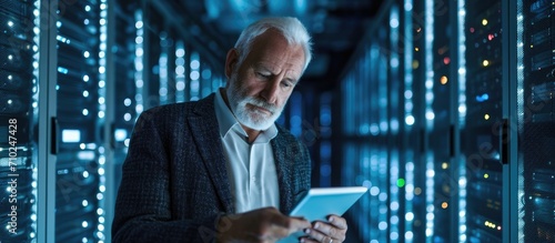 Elderly admin uses tablet to analyze server cyber threats caused by unsecure network connections. Skilled employee safeguards high-tech area from DDoS attacks.