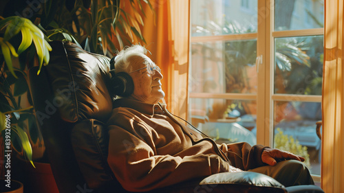 Elderly gentleman with headphones, lost in music while resting in an armchair near a window