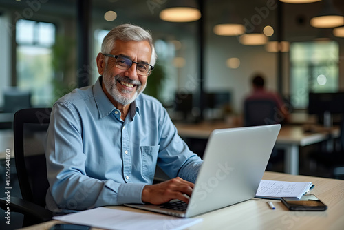 Elderly Indian Businessman Grinning at Laptop in Office Amidst Hustle and Bustle