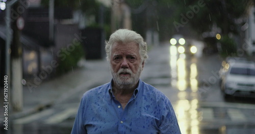 Elderly man standing alone in the rain on empty city street, expression of quiet grief and resignation in emotional wide shot
