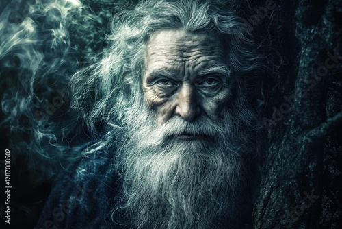 Elderly man with long hair and beard surrounded by wisps of smoke in a dark forest