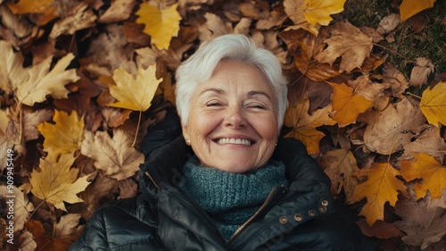 Elderly white woman with grey hair smiling while lying among autumn leaves