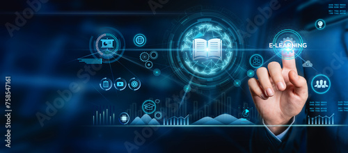 E-learning concept, touching the E-Learning icon on online education, e-learning education concept, learning online with webinars, reading or studying tutorials, internet lessons
