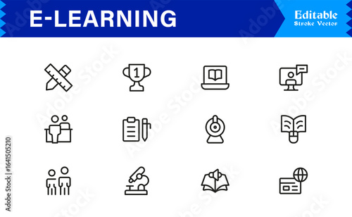 E-learning Icons Collection with Education, Training, and Online Study Graphics in Minimal Vector Line Style