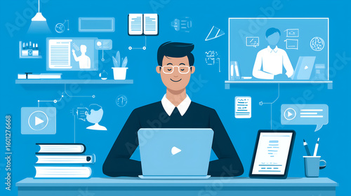 E-learning with Laptop: This illustration encapsulates the essence of modern digital education, with a focused individual engrossed in learning via a laptop.