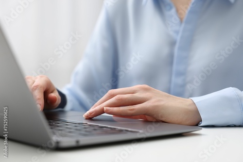 E-learning. Woman using laptop at white table indoors, closeup