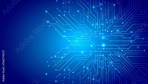 Electric blue circuit board pattern with glowing connections and intricate network design.