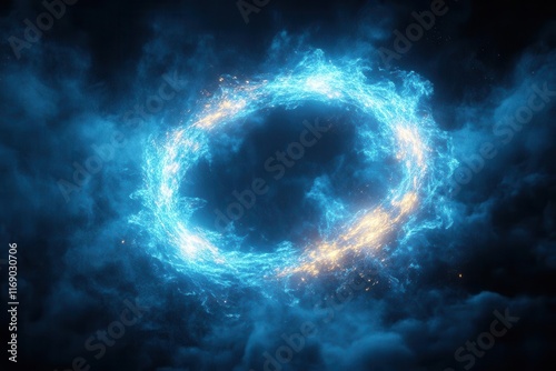 electric blue holographic circles illuminating a plasma portal pulsating with energy and light set against a stark black background creating a futuristic and mesmerizing visual effect