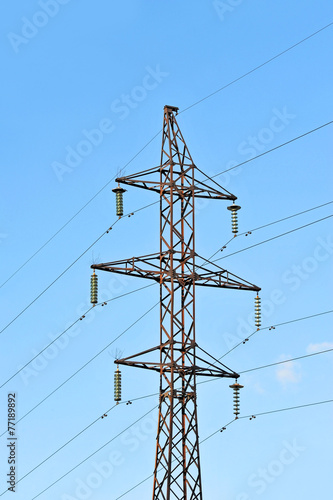 Electric lines pylon on blue sky background