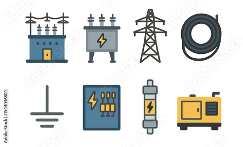 Electric power infrastructure icons: substation, transformer, tower, cable, grounding, panel, fuse, generator