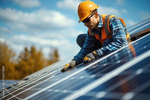 Electrical engineer installing a solar panel roofing. Generative AI.