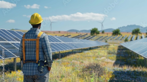 Electrical engineer supervising a team of technicians during solar panel installation, overseeing precise mounting and alignment.