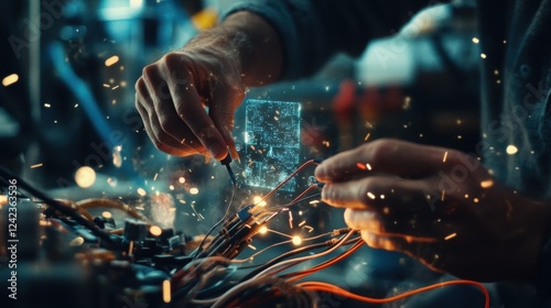 Electrical engineer working on a complex circuit board, connecting wires and creating sparks, while a futuristic hud interface projects a schematic diagram