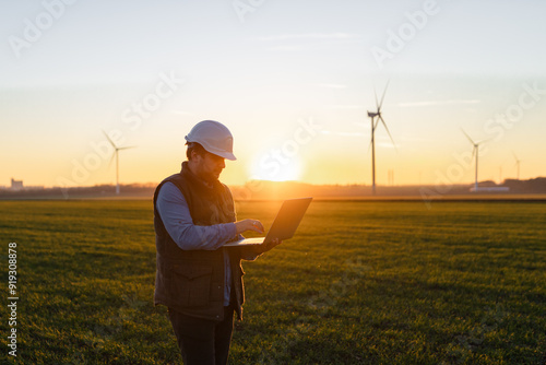 Electrical engineers working at wind turbine power generator station with laptop computer
