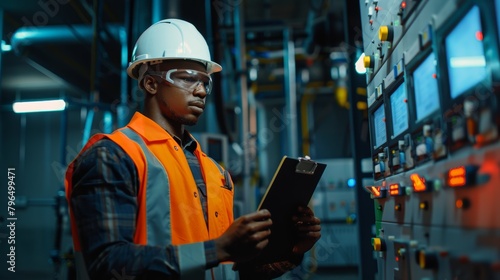 Electrician, control room technician, and man write notes and machine maintenance on clipboard. Male electrician, power system and substation, engineering inspection, checklist