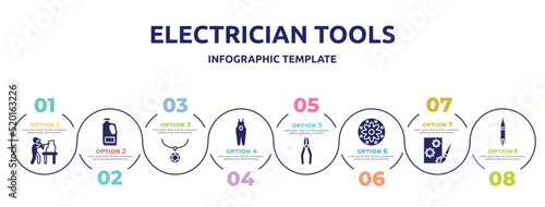 electrician tools concept infographic design template. included sculptor, detergent, rhinestone, overalls, crimping pliers, applique, decoupage, voltage indicator icons and 8 option or steps.