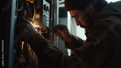 Electrician wiring a new electrical panel in a basement. Featuring skill and safety