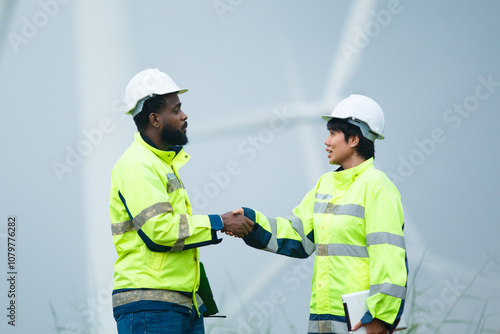 Electricians having a conversation and discussion at electric generator windmill station.