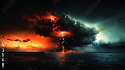 Electrifying Thunderstorm with Dramatic Zig Zag Lightning Bolts Streaking across a Foreboding Moody Cloudy Landscape Charged with Primal Natural Energy and Sublime Surreal Atmosphere