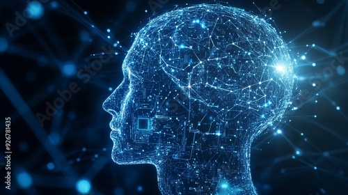Electronic brain concept and artificial intelligence graphic featuring a digital brain and human head outline made from a circuit board connected on a dark blue background