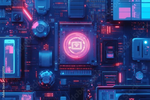 Electronic circuit board with glowing wifi icon, can be used to illustrate tech concepts