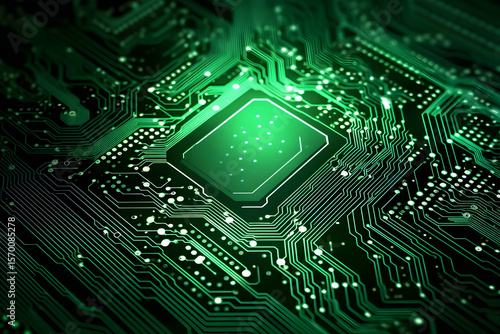 Electronic Circuitry: A mesmerizing close-up of an electronic circuit, illuminated in vibrant green, symbolizes technological advancement and interconnectivity in the digital age.
