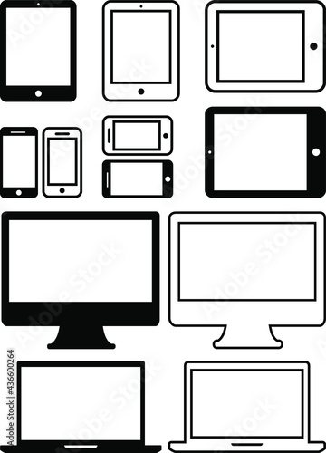Electronic devices - computer monitor, phone, tablet, and laptop isolated on white background. Vector iilustration set of black icons. EPS 10