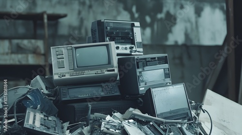 Electronic waste pile of discarded computer monitors, keyboards, and other electronic devices, symbolizing the growing issue of e-waste and the need for sustainable technology solutions.