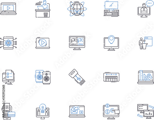 Electronics outline icons collection. electronics, gadgets, TVs, phones, computers, laptops, tablettes vector and illustration concept set. screens, cameras, audio linear signs