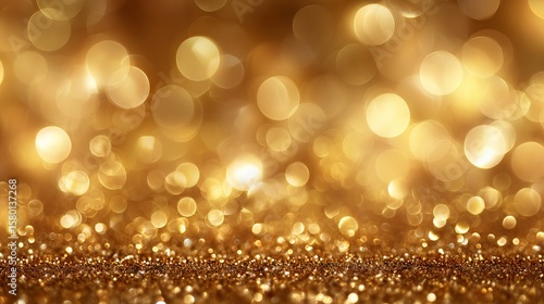 Elegant abstract background with defocused circular golden bokeh lights and sparkling glitter for festive Christmas, New Year, wedding, or luxury celebration design