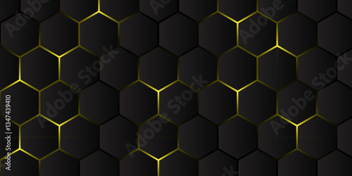 Elegant Abstract Hexagonal Texture with Golden Glow. Modern Black and Gold Honeycomb Pattern for Design. Hexagon. Vector.