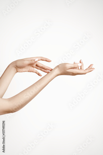 Elegant and graceful hands with slender graceful fingers applying moisturizing hand cream isolated on white. Health and beauty concept.