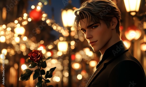 Elegant anime man with sharp jawline, dressed in a tailored suit, holding a rose, standing under romantic lanterns in a European-inspired plaza.