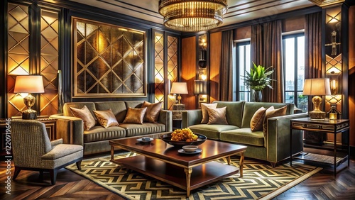 Elegant Art Deco Interior Design: Luxurious Living Room with Geometric Patterns and Deep Focus