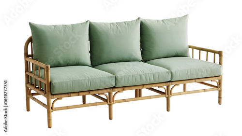 Elegant bamboo sofa with light green cushions isolated on transparent background, a stylish addition to any living space