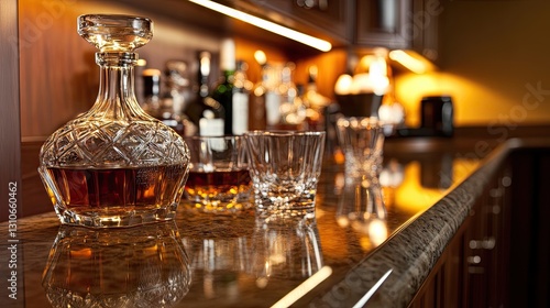Elegant bar setup with a sophisticated decanter, premium whiskey glasses, and warm lighting.