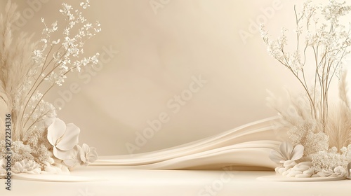 Elegant beige floral display with flowing fabric backdrop