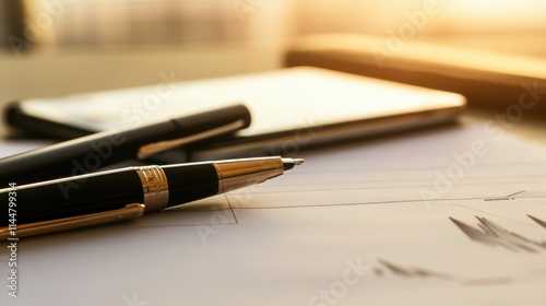 Elegant black and gold pen placed on a detailed financial report with geometric bar charts and data visualizations, embodying professionalism and minimalist office aesthetics.