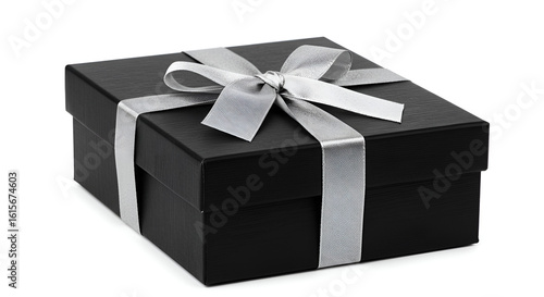 Elegant Black Gift Box with Silver Ribbon on White Background