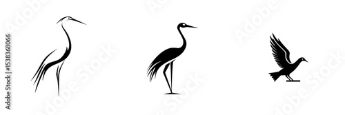 Elegant black icons of cranes and birds for graphic design use in various creative projects and applications