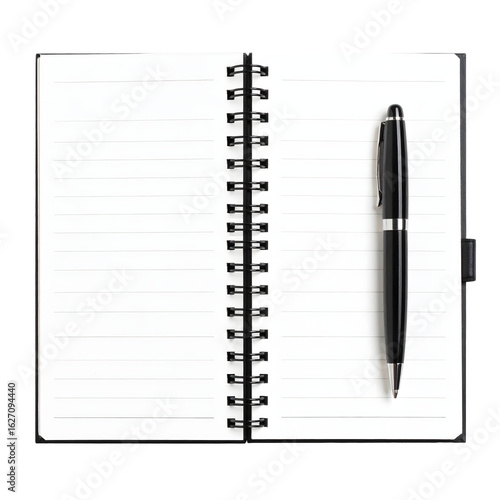 Elegant black pen resting on an open spiral notebook with clean lined pages, ready for writing and planning.