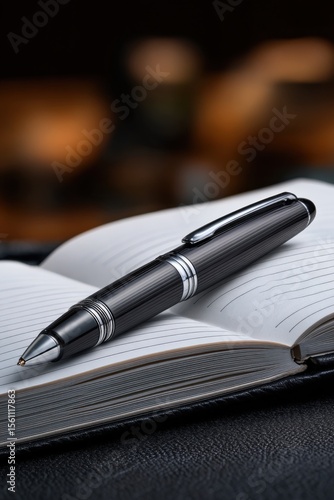 Elegant black pen resting on open lined notebook with blurred warm background showcasing writing tools and creative workspace ambiance